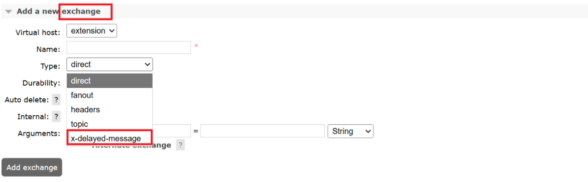 在RabbitMQ管理平台查看,新建交换机时是否有延迟消息选项,如果有就说明延迟消息插件已经正常运行了。