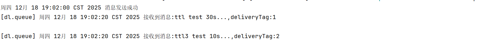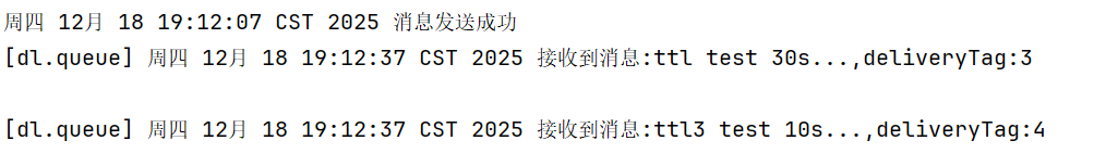 可以看到,因为设置消息TTL是在消费者进行消费时进行判定,而队列是先进先出的,所以延时10s的消息会在30s的消息出队后再被判定为过期。