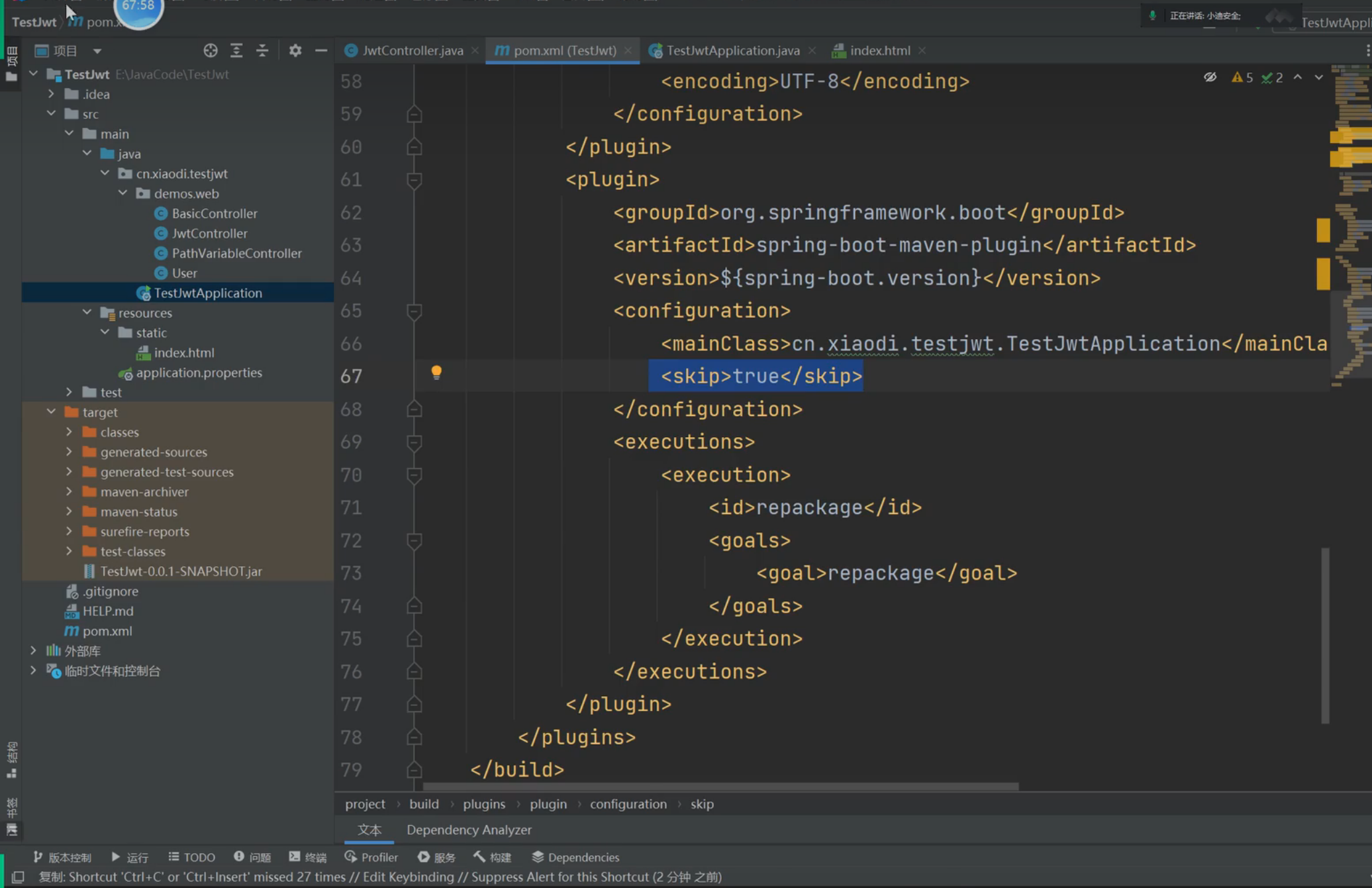 **解决办法:**注意看configuration这部分,把skip代码块改成false/删除,或加上mainClass代码块部分