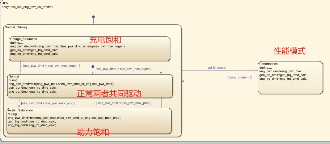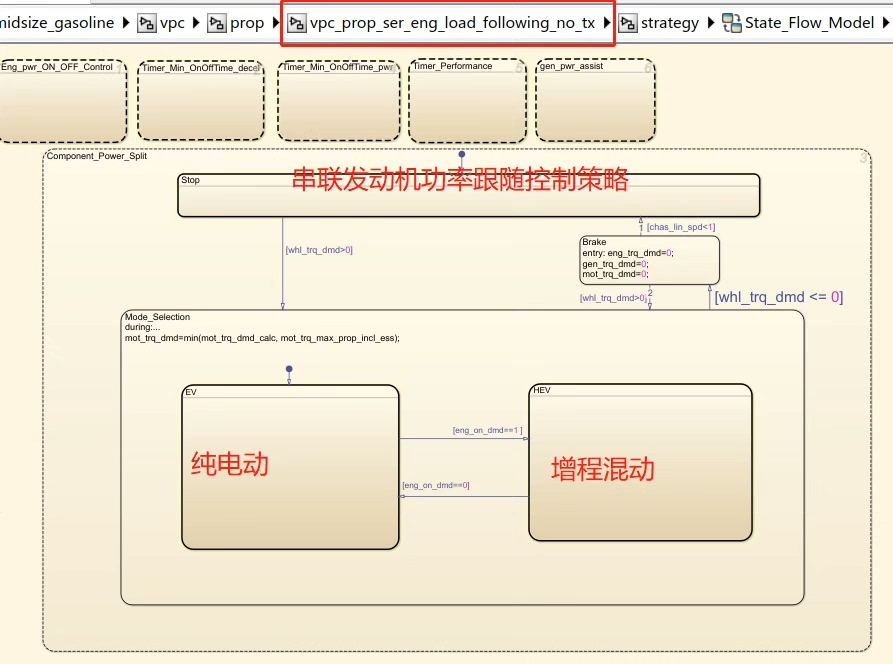 模型架构分得挺明白:整车控制器(HCU)坐在最上层,底下挂着发动机-发电机组、驱动电机、动力电池三大件。道路环境模块里预置了CLTC-P和NEDC工况,要是想自己搞个山路十八弯的测试工况,直接把.mat文件往Drive_Cycle库里一扔就能调用。看这段动力请求处理的核心代码: