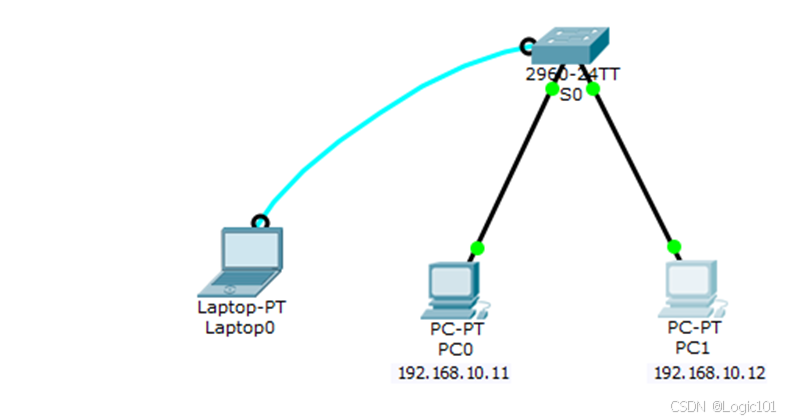 1.用直通线将PC0、PC1与交换机通过快速以太网端口进行连接;用配置线将笔记本的COM串口与交换机的console口进行连接。