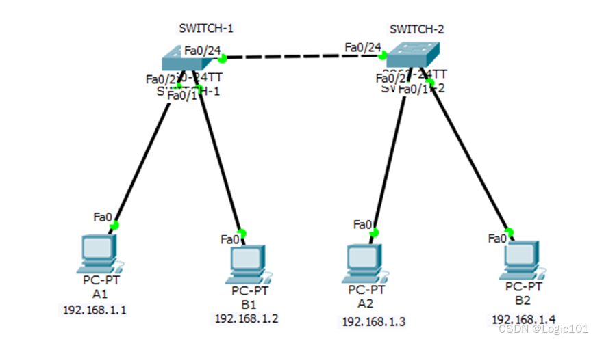 1.用直通线将PC A1、B1与交换机SWITCH-1连接,PC A2、B2与交换机SWITCH-2连接,再用交叉线将交换机SWITCH-1的fa0/24与SWITCH-2的fa0/24连接。PC与交换机的接口对应关系如下: