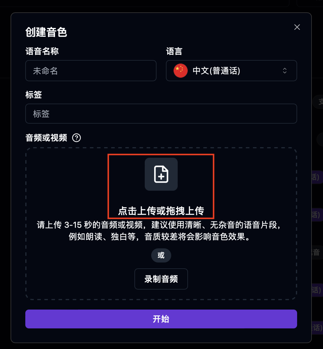步骤4:提交样本:上传一段需克隆的清晰人声音频或视频(建议时长3-15秒),或直接使用麦克风录制。