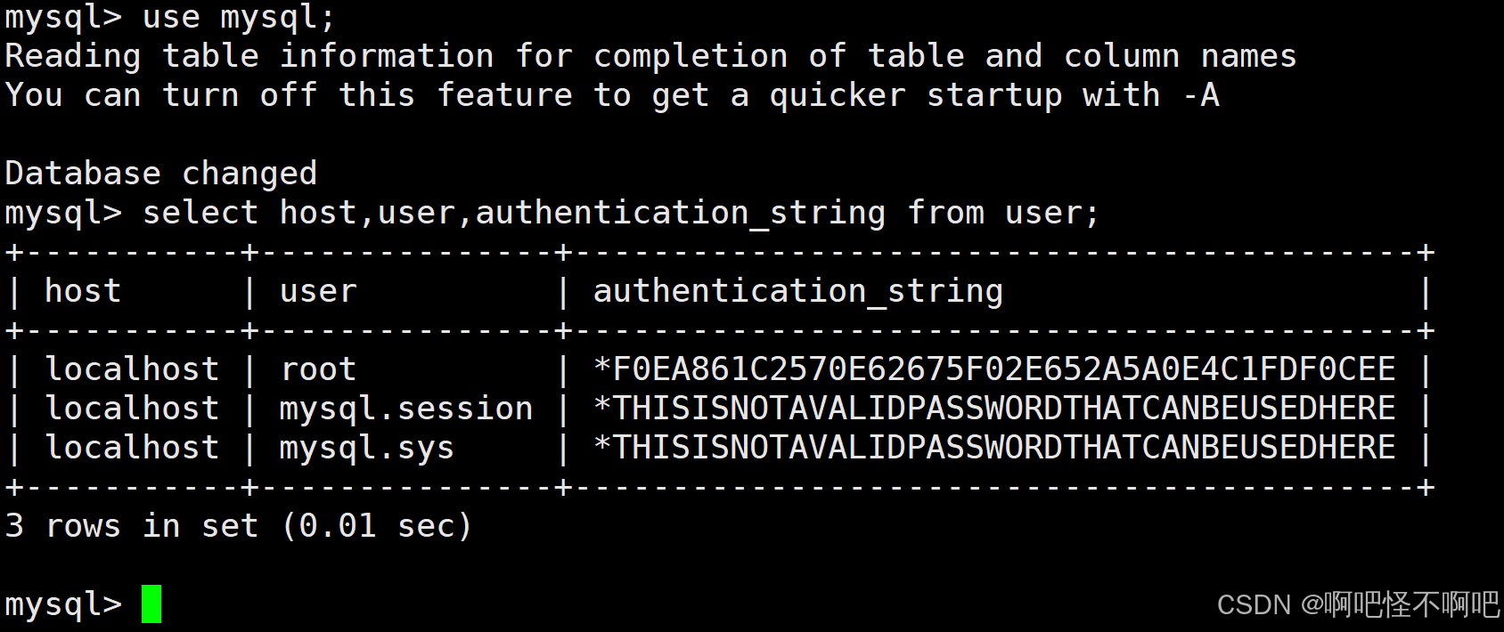 不知道各位有没有这个疑惑,就是我是查看用户信息又不是所有某一个数据库,为什么需要先use mysql呢?这是因为在mysql这个数据库系统里面,用户相关的各种信息也是存放在表里面的。