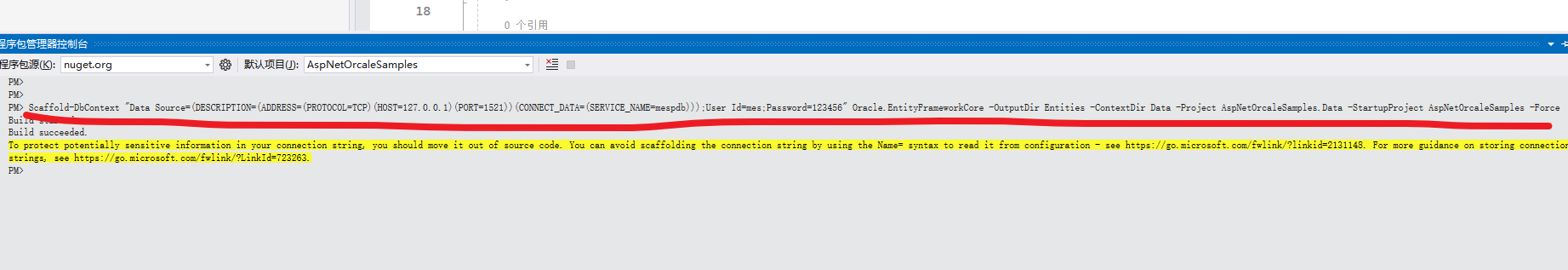Scaffold-DbContext "Data Source=(DESCRIPTION=(ADDRESS=(PROTOCOL=TCP)(HOST=127.0.0.1)(PORT=1521))(CONNECT_DATA=(SERVICE_NAME=mespdb)));User Id=mes;Password=123456" Oracle.EntityFrameworkCore -OutputDir Entities -ContextDir Data -Project AspNetOrcaleSamples.Data -StartupProject AspNetOrcaleSamples -Force