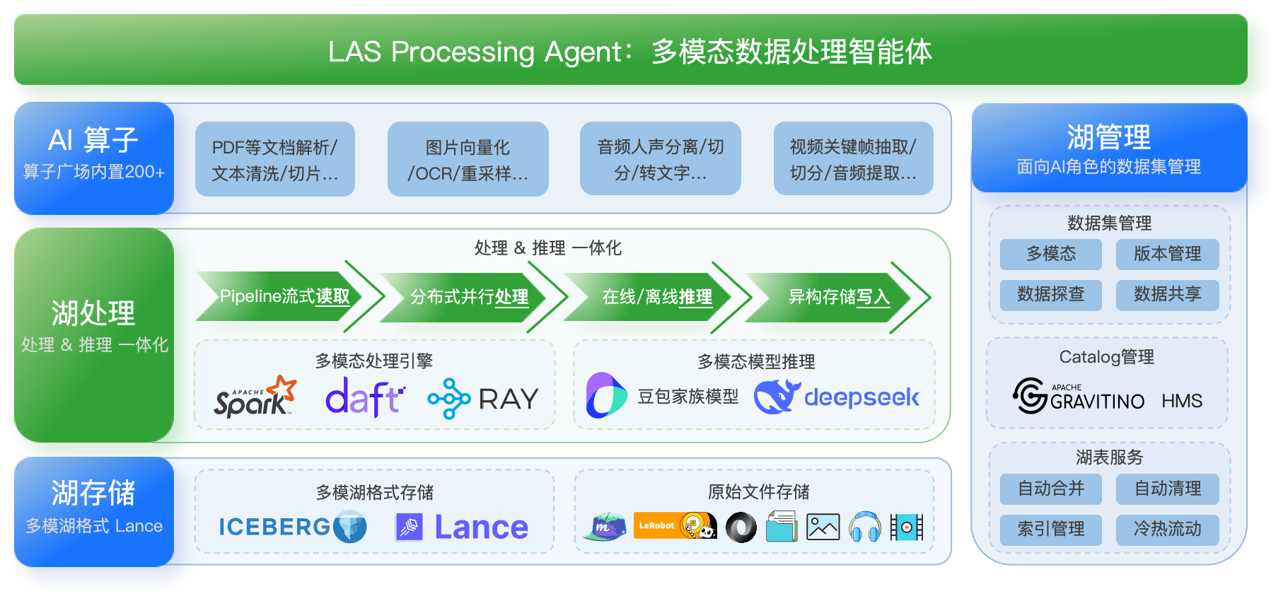 LAS AI 数据湖产品是火山引擎为企业适应AI Agent时代推出的新一代多模态场景解决方案,孵化于字节跳动大模型训练场景,面向多模态数据场景,提供湖存储、湖管理、湖计算三大能力、通过"湖存储Lance+湖计算Daft"为核心要素,针对性解决视频、图片等非结构化数据处理的痛点。