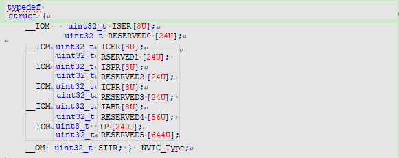 NVIC 相关的寄存器定义了可以在 core_cm3.h 文件中找到。我们直接通过程序的定义来分 析 NVIC 相关的寄存器,其定义如下: