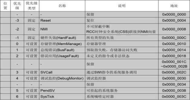 什么是 NVIC?NVIC 即嵌套向量中断控制器,全称 Nested vectored interrupt controller。它是内核的器件,所以它的更多描述可以看内核有关的资料《Cortex-M3 权威指南》。M3 内核都是支持 256 个中断,其中包含了 5 个系统中断和 240 个外部中断,并且具有 256 级的可编程中断设置。然而芯片厂商一般不会把内核的这些资源全部用完,如 STM32F103ZET6 的系统中断有 10 个,外部中断有 60 个。下面我们看看系统中断部分: