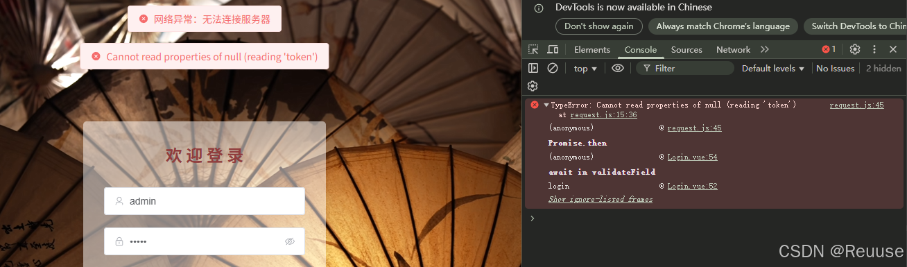 TypeError: Cannot read properties of undefined (reading 'status')(request.js)TypeError: Cannot read properties of null (reading 'token')(request.js)结论:登录业务本身没坏,坏的是异常分支的健壮性 :网络失败时 Axios 没有
