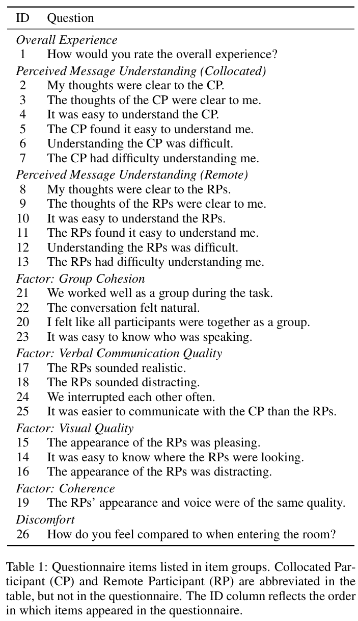 Rendle G, Immohr F, Kehling C, Lammert A, Kreskowski A, Brandenburg K, et al. Influence of Audiovisual Realism on Communication Behaviour in Group-to-Group Telepresence. Proceedings - 2025 IEEE Conference on Virtual Reality and 3D User Interfaces, VR 2025, 2025. https://doi.org/10.1109/VR59515.2025.00080.