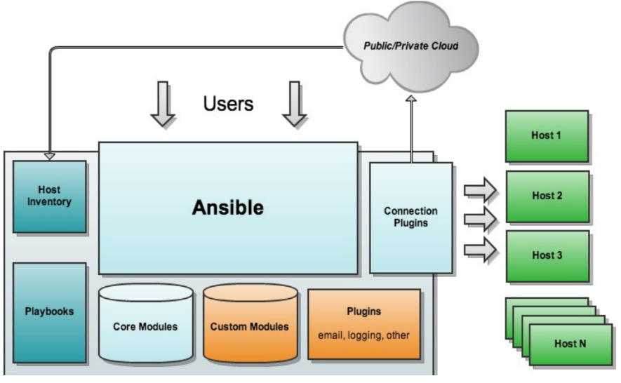 Ansible 通过 SSH 将模块推送到被管理节点执行,执行完后自动删除。可结合 SVN 等工具管理自定义模块及任务编排。