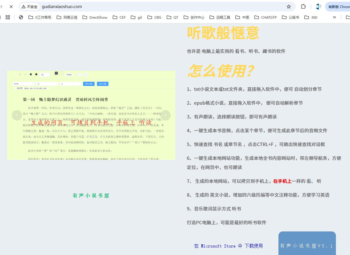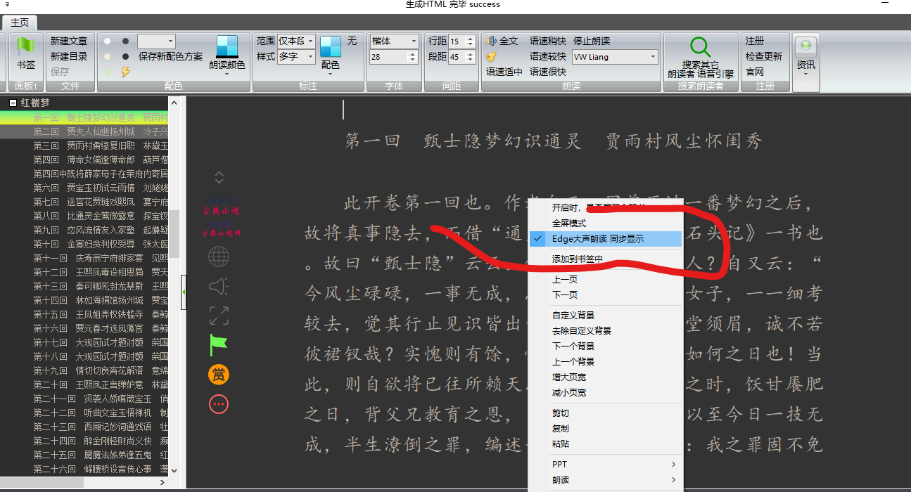 有声小说书屋5.1版,新增了 edge 大声朗读同步显示功能, edge里大声朗读的文字,可以同步显示在 有声小说书屋软件中。