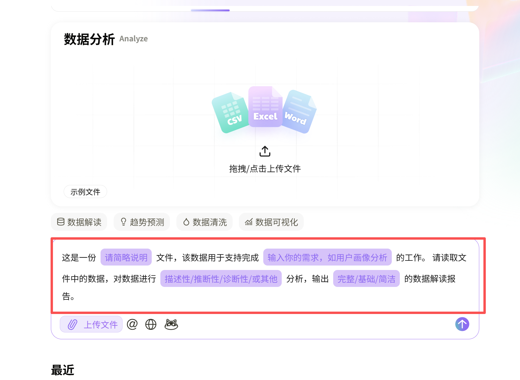 - 在垂直具体场景中,无需复杂提示词,产品提供的提示性词句已足够精准引导操作。
