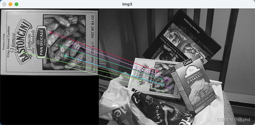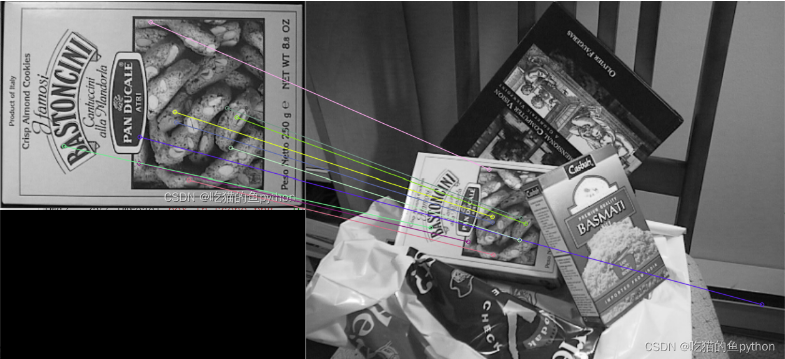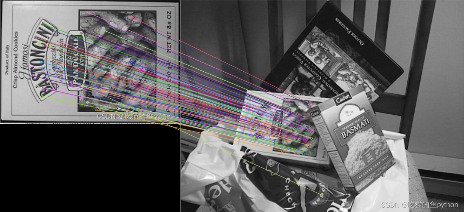 k对最佳匹配是指,每一个特征点在另一张图片上都会有k个最匹配的点存在,例如k=2,它会给每个特征点画两根匹配线。通过对比可以过滤掉一部分点。如果需要更快速完成操作,可以尝试使用cv2.FlannBasedMatcher。