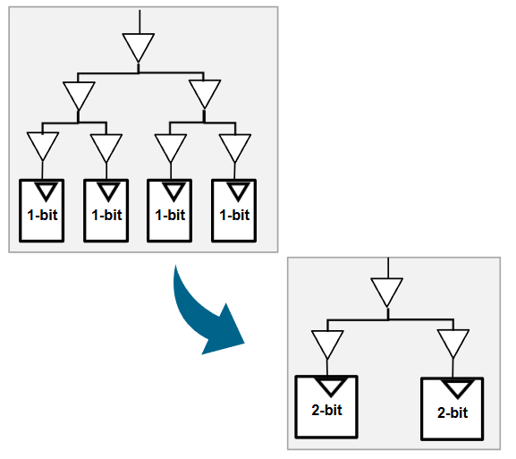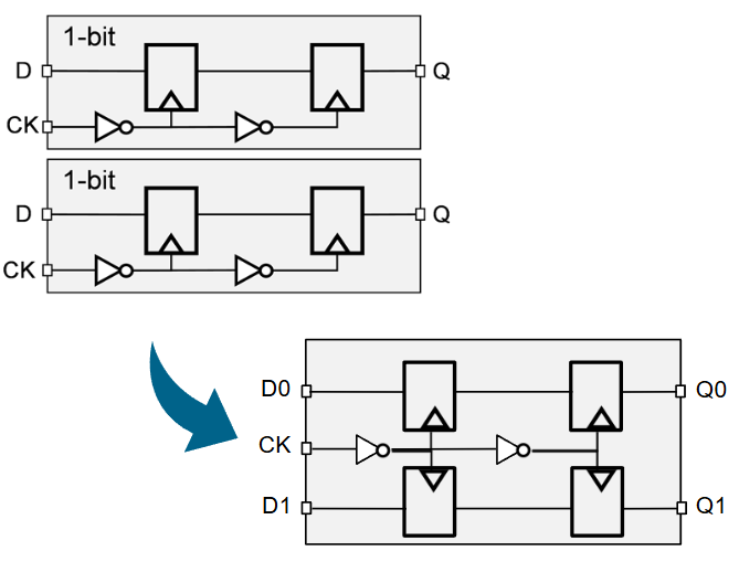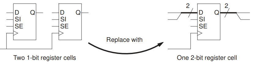 综合(例如Design Compiler)与物理实现(例如IC Compier II)工具可以在将多个单比特触发器组织为多比特触发器,例如八个单比特触发器可以改用一个八比特触发器或两个四比特触发器实现,这个优化过程被称为Multibit Banking,图1展示了一个具体案例。