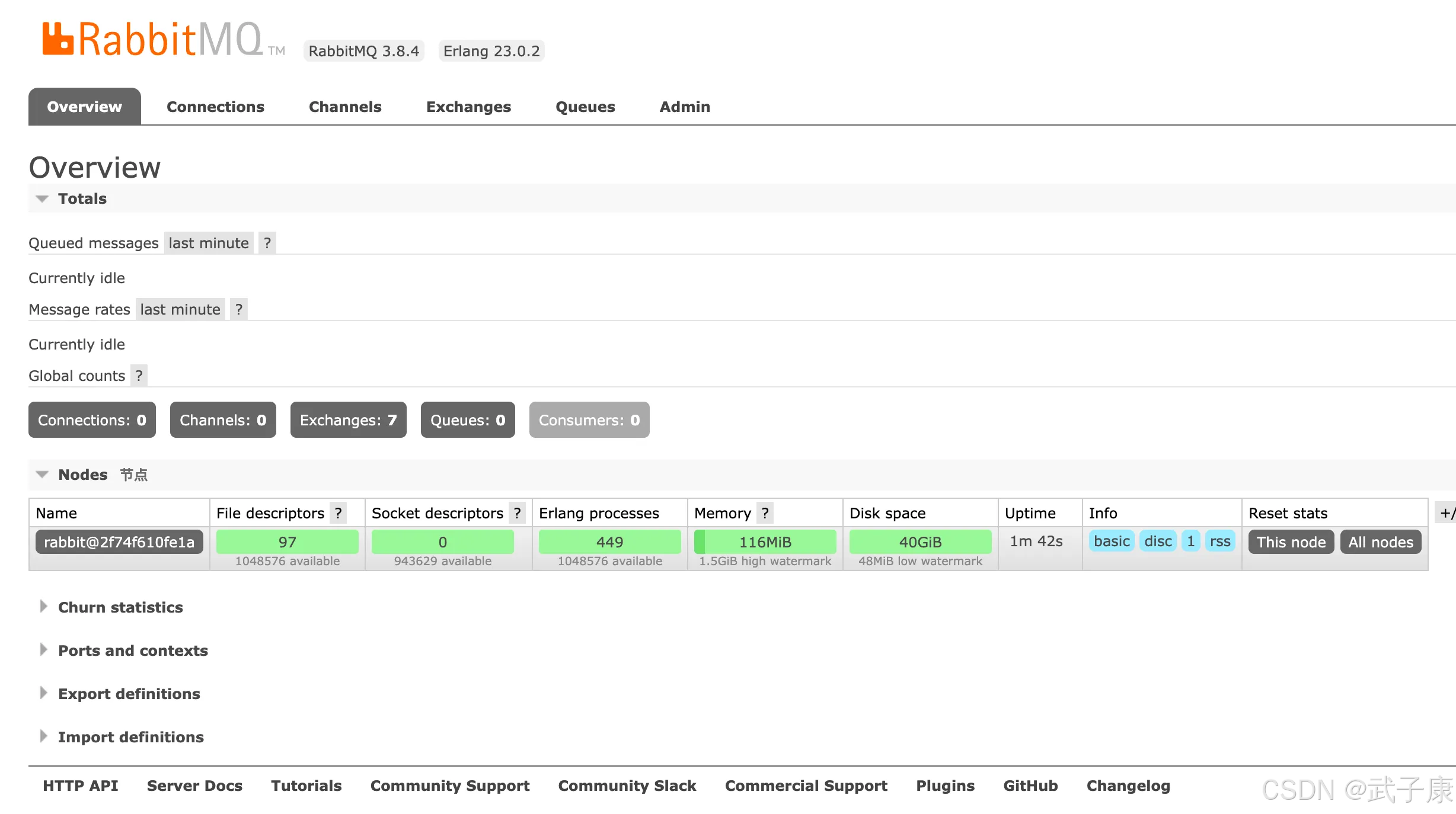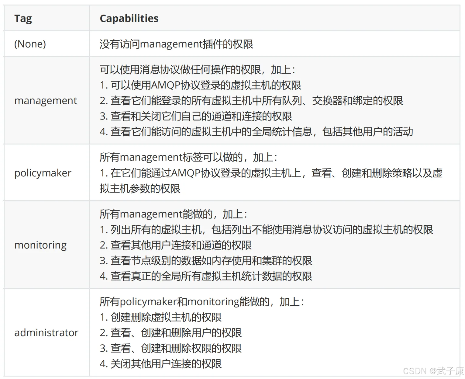 administrator:管理员权限,拥有所有操作权限monitoring:监控权限,可以查看所有信息但不能修改policymaker:策略制定权限,可以管理虚拟主机策略management:基本管理权限,可以使用管理插件