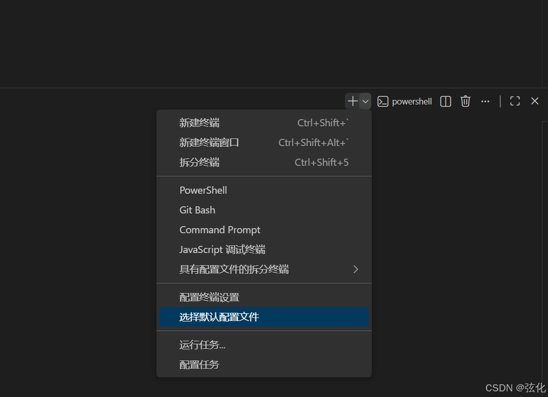 - 注意到如果不进行默认终端设置,默认使用的终端为powershell,但不能直接运行,