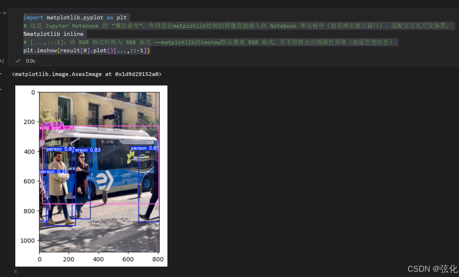 编写代码块(如 YOLOv8 预测代码),按 Shift+Enter 运行,实时查看结果;