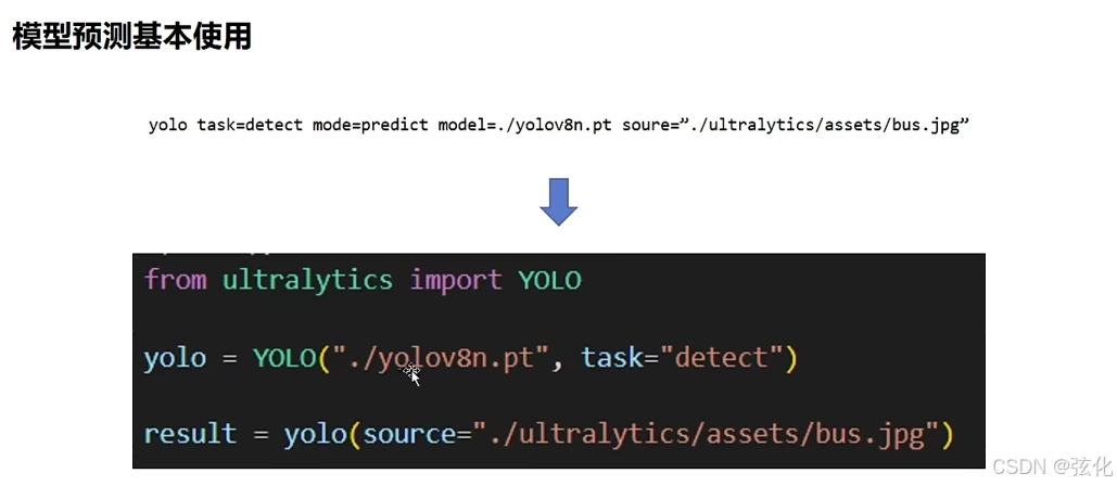 命令行方式:通过yolo命令直接调用,参数包括task=detect(任务:目标检测)、mode=predict(模式:预测)、model(模型文件)、source(输入图片路径)。