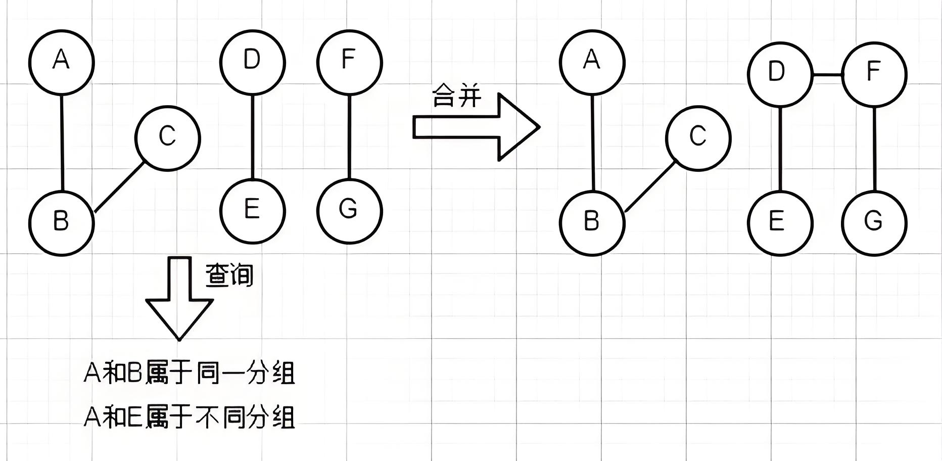 合并操作用于合并两个分组,即将两个分组的代表元素连接起来,使它们成为同一个分组。