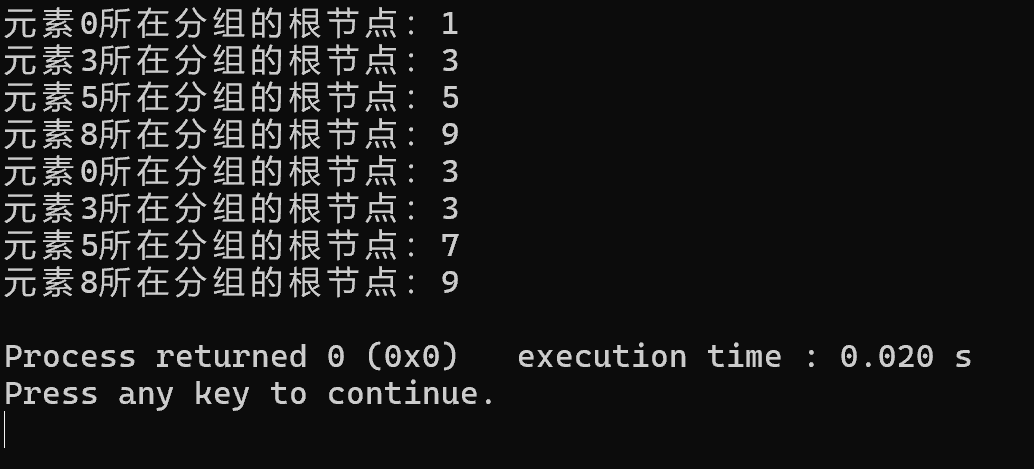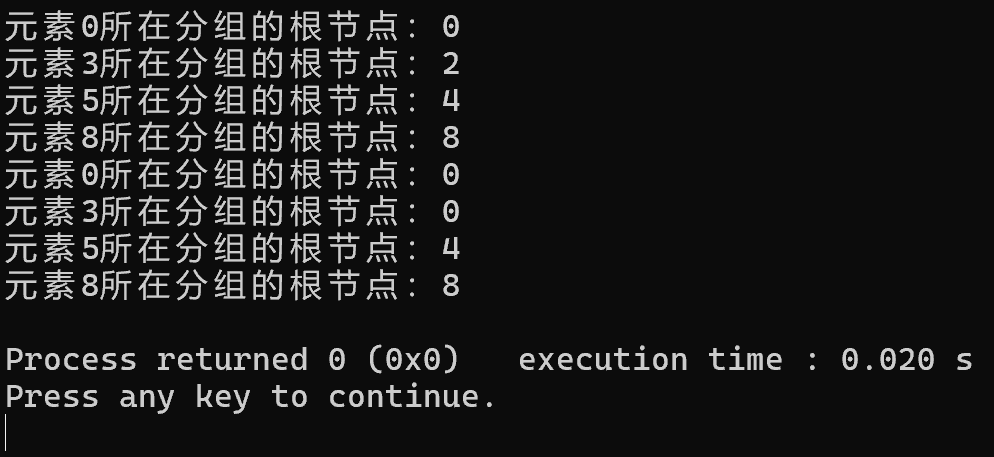 cout << "元素0所在分组的根节点:" << uf.find(0) << endl;