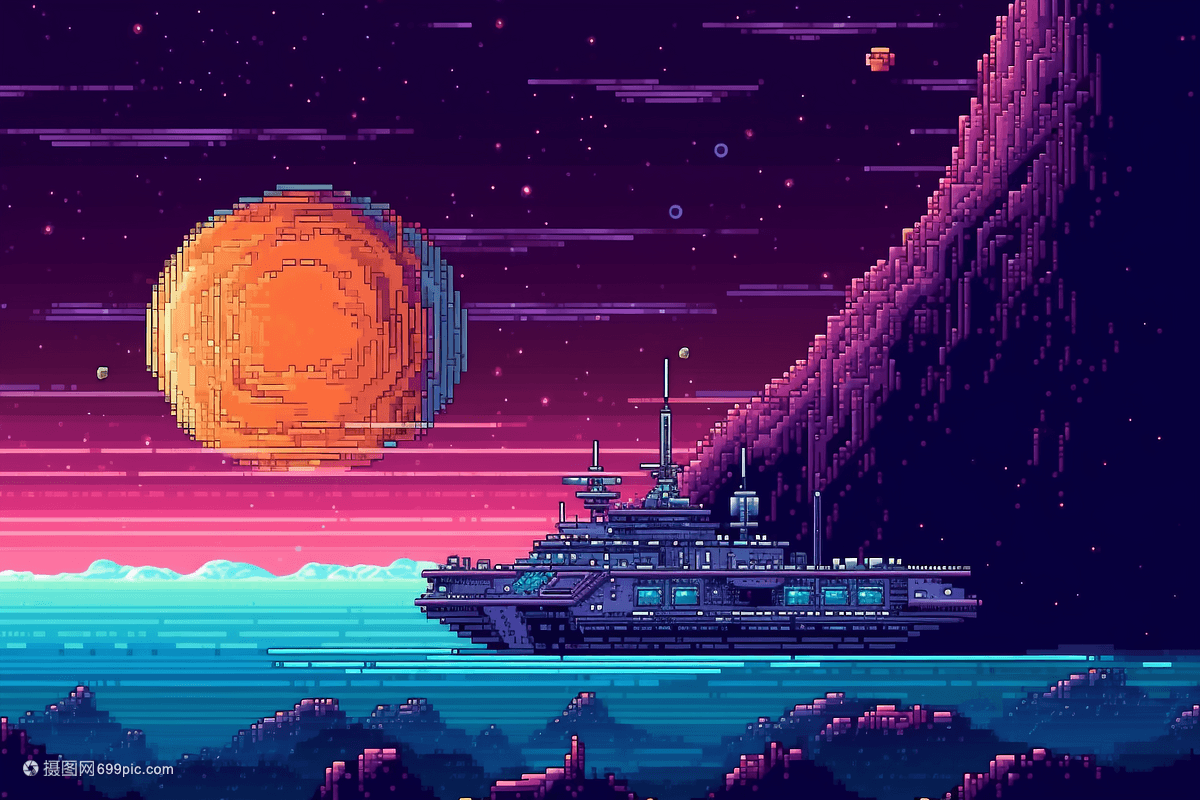 图片核心元素表达:这张图片的主题是:像素化的卫星:插画师笔下的数字星轨、探索遥远星球飞船,图片中包含的元素有:像素卫星 数字星轨 插画像素风