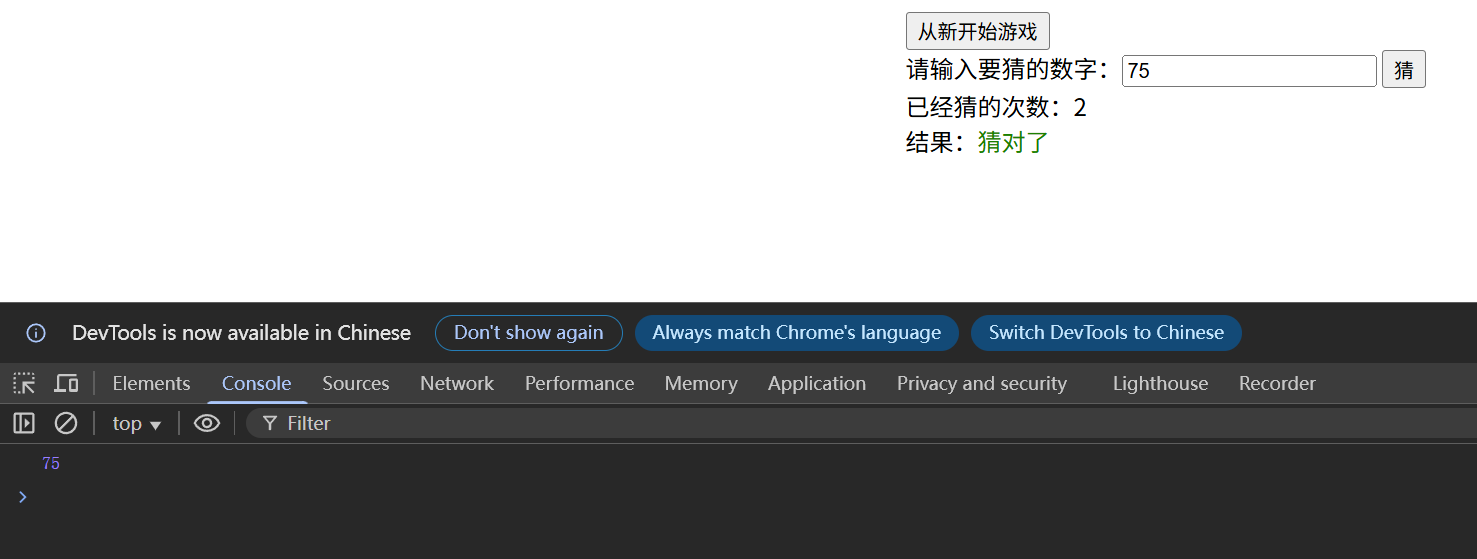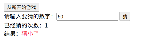 点击这里重新开始就会重新生成1~100之间的数字,猜的次数重置为0