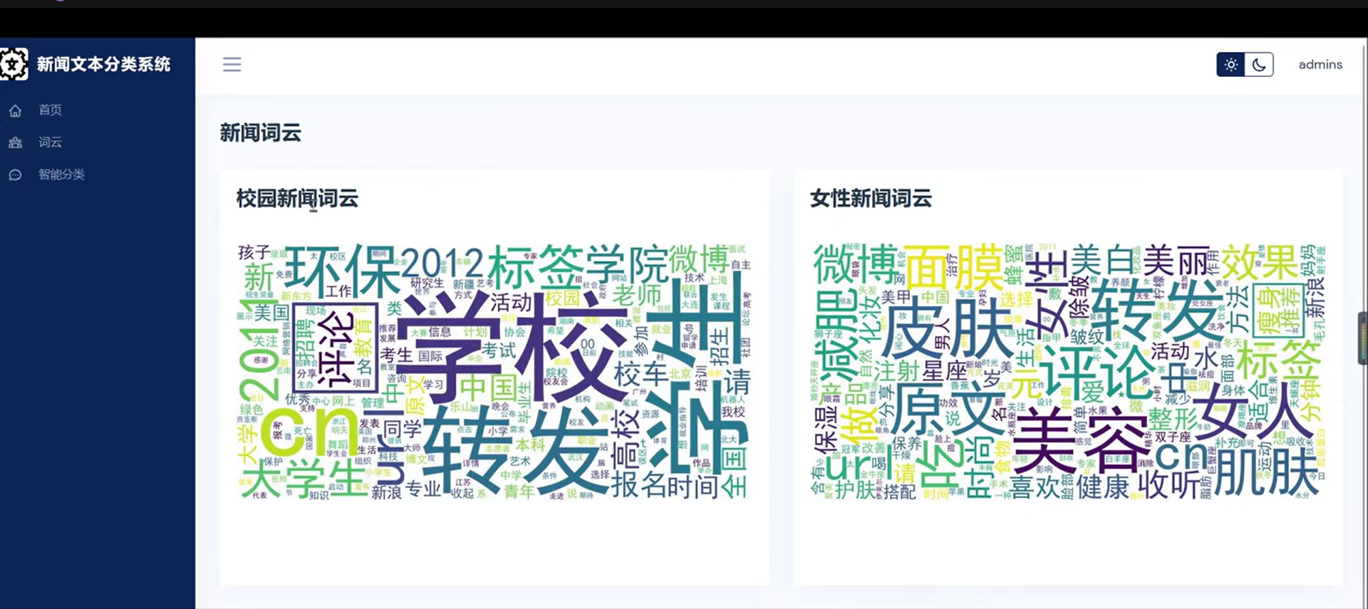 - 用户端交互功能:用户注册 / 登录、新闻浏览、分类结果查看、情感分析结果可视化展示(如词云图、趋势图),支持精准获取目标实习相关新闻。