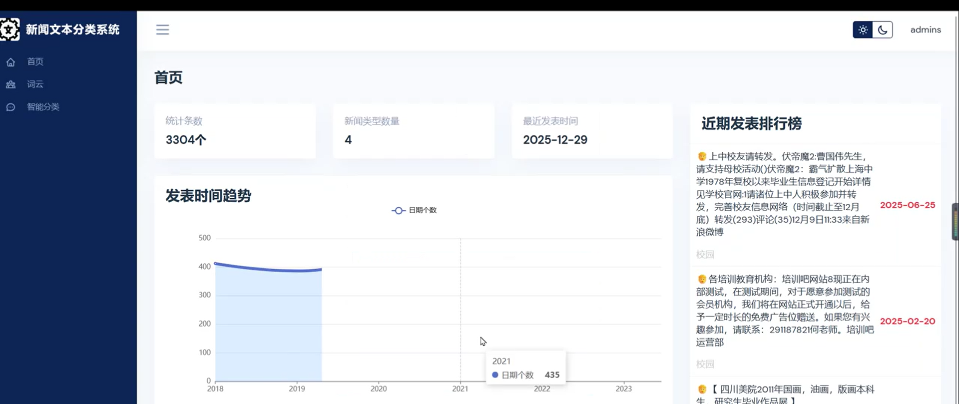 - 可视化与推荐功能:新闻发布时间趋势统计、分类结果可视化(柱状图、词云)、基于分类与情感分析的个性化新闻推荐,提升信息获取效率。