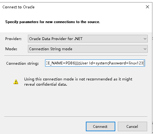 Data Source=(DESCRIPTION=(ADDRESS=(PROTOCOL=TCP)(HOST=192.168.207.16)(PORT=1521))(CONNECT_DATA=(SERVICE_NAME=PDB6)));User Id=system;Password=linux123;