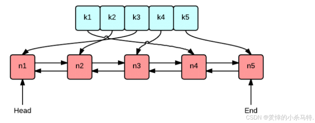 - 那么此时的list保存的不是简单的value,而还需要保存对应的key(比如删除对应冷数据的时候,list可以快速删除,那哈希如何快速删除(根本不知道对应的key),因此需要通过list尾部不仅能删除,冷数据而且还能获取对应key方便哈希进行指定节点数据删除)。