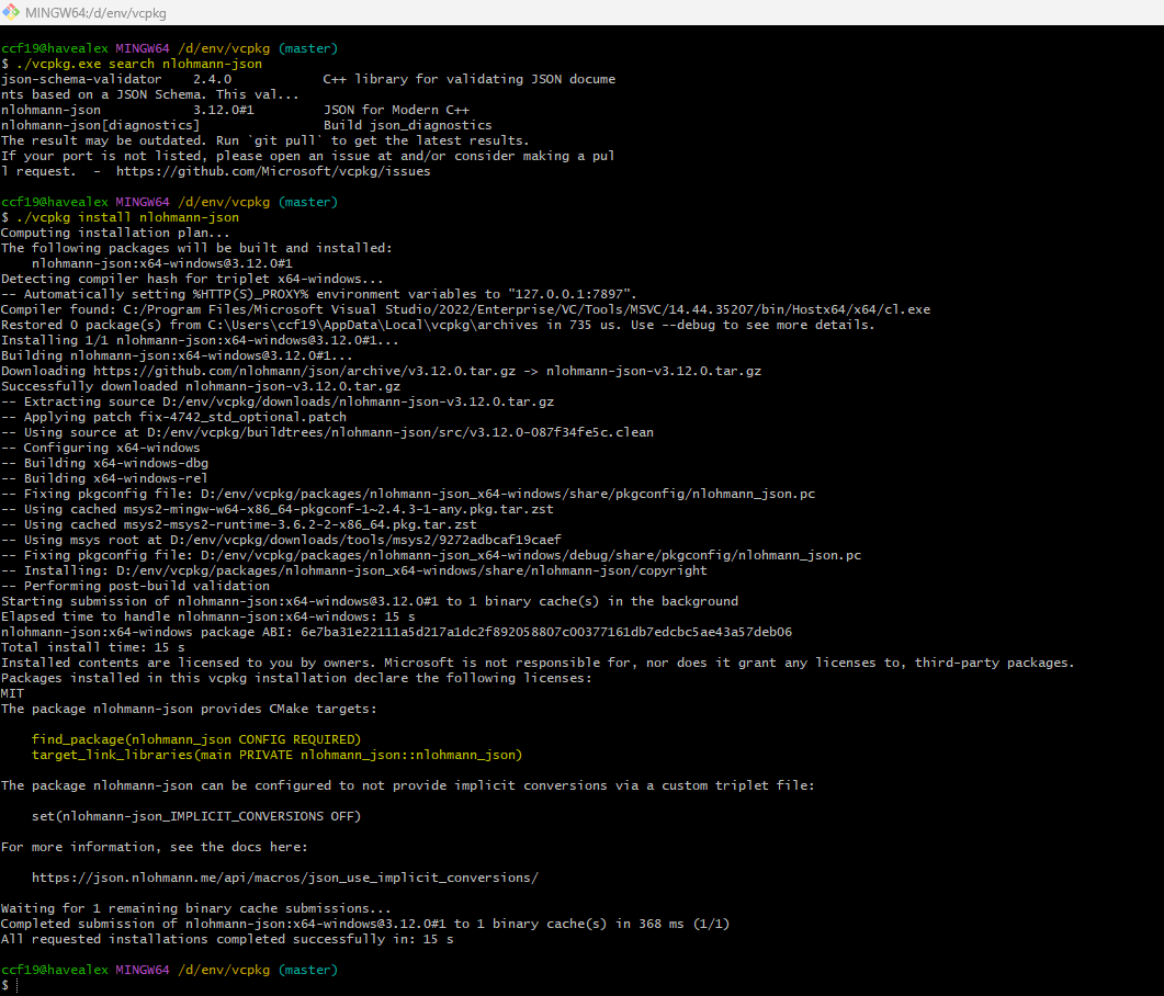 找到之后,可以通过./vcpkg install nlohmann-json在vcpkg中安装nlohmann-json