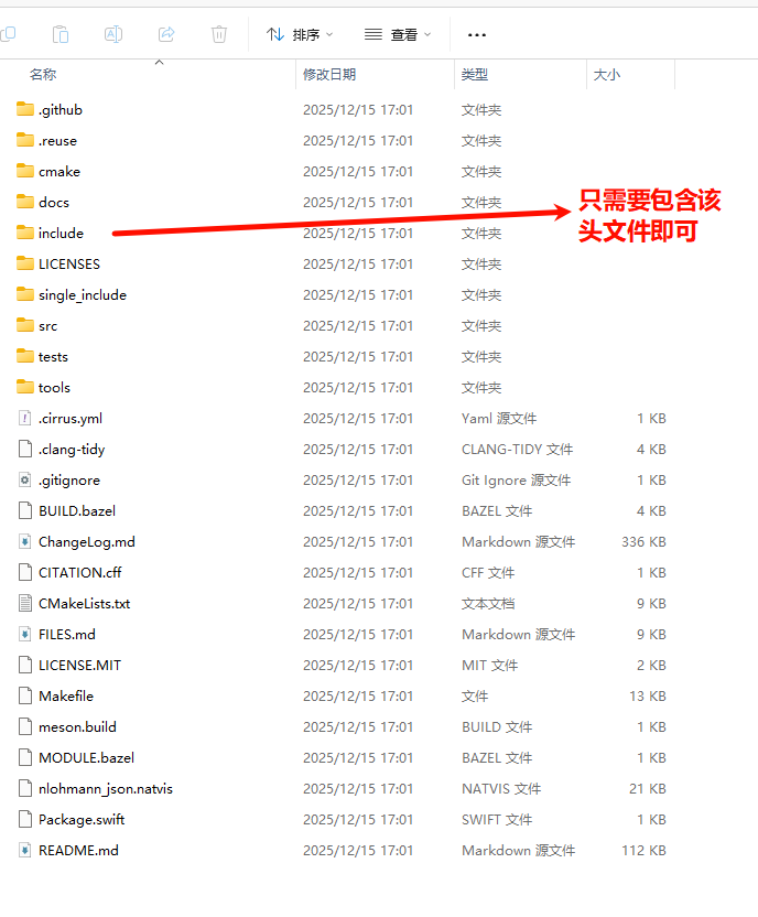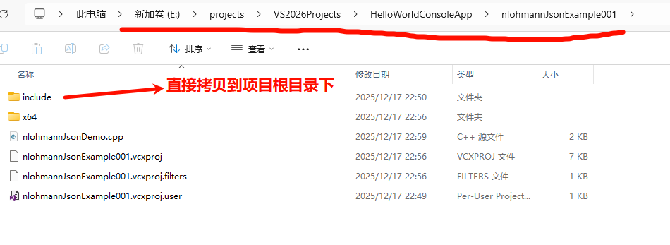 在Windows11上使用VS2026新建一个C++控制台项目,将下载后的E:\projects\json-develop\include目录拷贝到C++项目根目录下,无须自己手动编译动态库或静态库,使用比较简单。