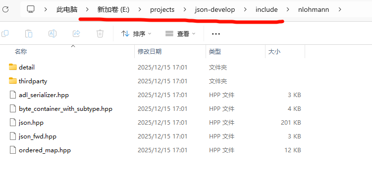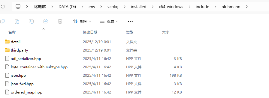 鼠标双击打开第2行的#include <nlohmann/json.hpp>可以看到json.hpp头文件所在路径为:D:\env\vcpkg\installed\x64-windows\include\nlohmann,如下图所示: