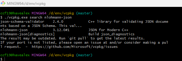 安装好vcpkg后,可以通过./vcpkg.exe seatch nlohmann-json搜索nlohmann-json库,如下图所示: