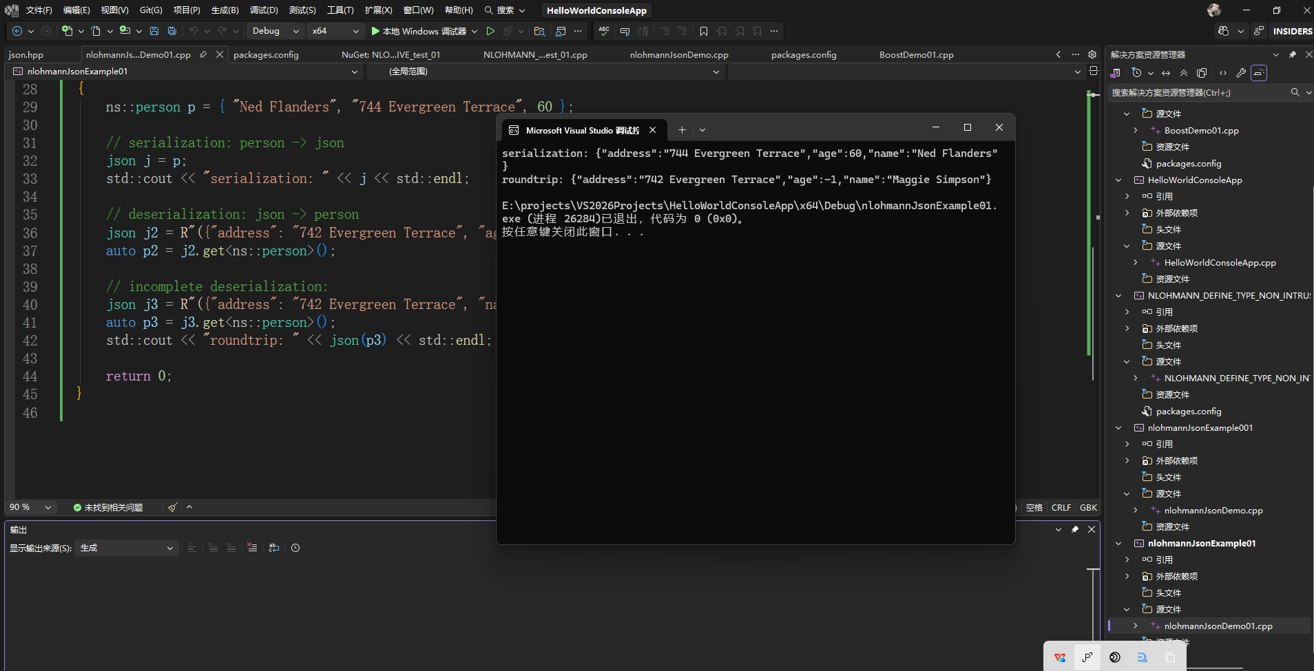在VS2026中创建一个空的C++控制台项目,添加一个nlohmannJsonDemo01.cpp的源文件,内容如下: