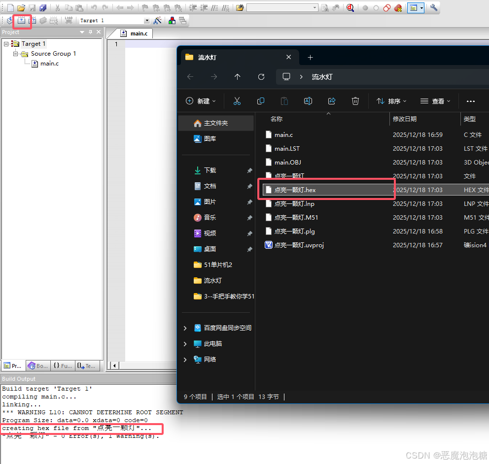 12,点击编译,最后在文件夹下面找到了生成的hex文件
