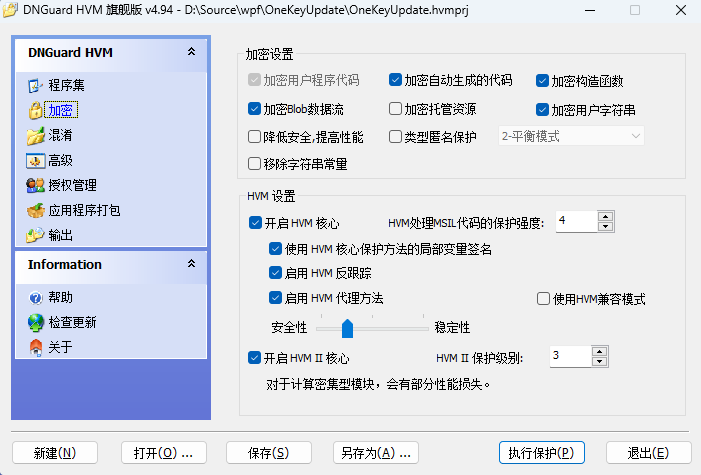 选择"加密程序存储路径",并启用自动生成的代码加密。建议启用加密核心 、HVM反调试 等选项来增加程序的安全性。