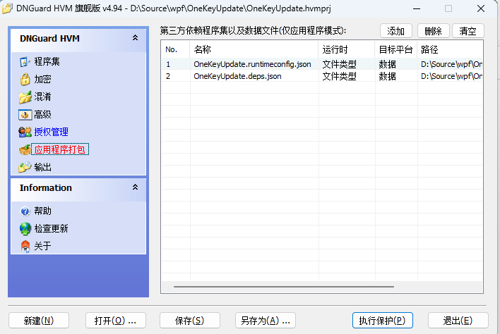 .json配置文件),可以在"应用程序文件包"选项卡中添加这些文件,确保它们与加密后的程序一起打包。