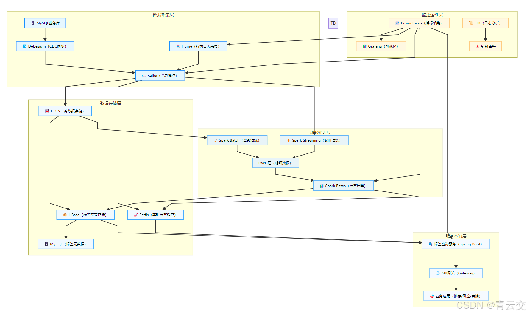 | 存储介质 | HDFS+HBase+Redis+MySQL | 1. 冷热分离:HDFS 存冷数据,HBase 存标签宽表,Redis 存实时标签;2. 成本与性能平衡 | 单一 HBase:冷数据存储成本高;MongoDB:查询性能不足,不适合标签宽表 |