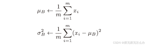 实现的公式也比较简单,首先是求均值和求方差,对mini-batch 的m个输入数据的集合B = {x1, x2, . . . , xm} 求均值和方差