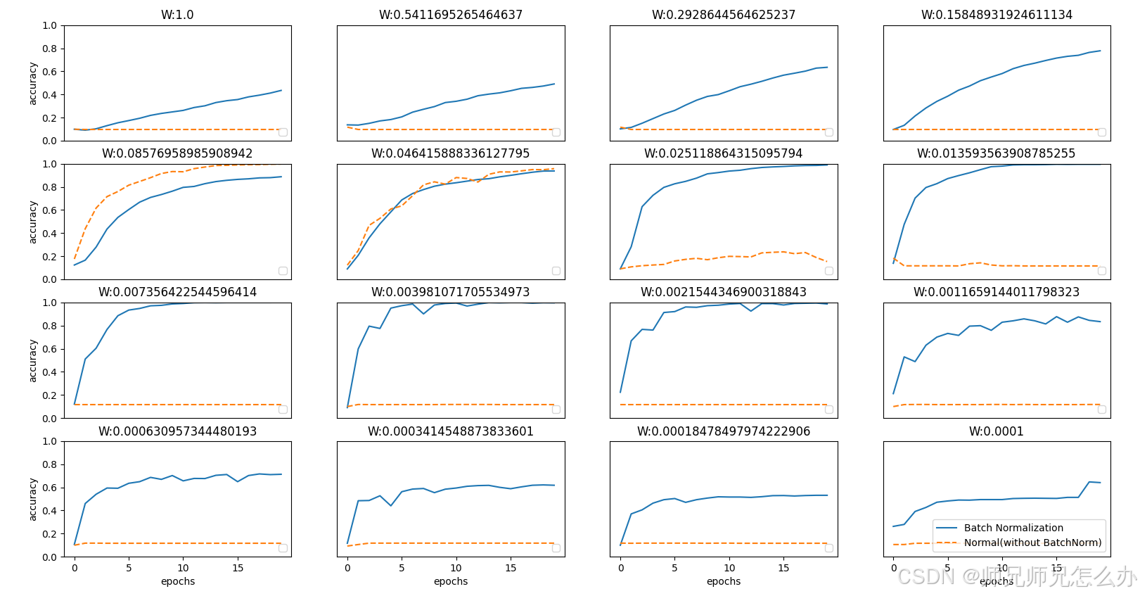 可以发现,几乎所有的情况下都是使用Batch Norm时学习进行得更快。同时也可以发现,实际上,在不使用Batch Norm的情况下,如果不赋予一个尺度好的初始值,学习将完全无法进行。