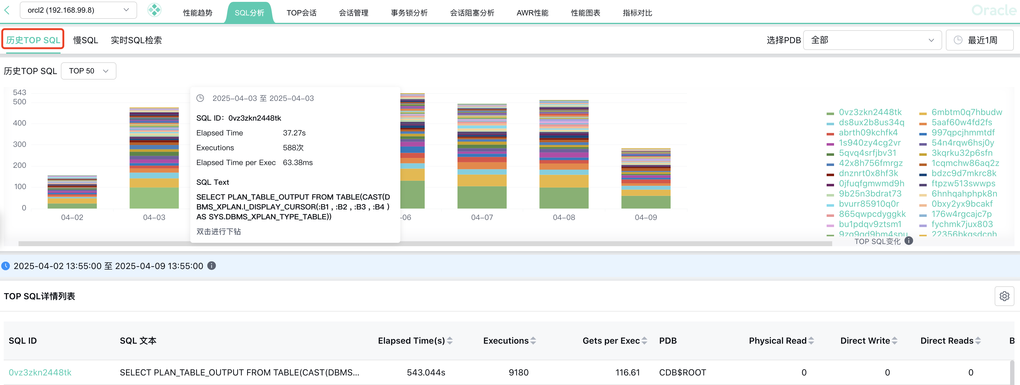 平台以数据库为中心,从集群到数据库全链路采集指标,涵盖数千条专业指标,采集频率可根据需求分档设置------高频(10秒)监控实例状态,中频(30秒/1分钟)跟踪等待事件、连接数,低频(10分钟及以上)统计空间、数据文件。这种高密度、低开销的采集模式,能实时捕捉TOP SQL、性能衰变语句,甚至提前识别新增低效SQL。
