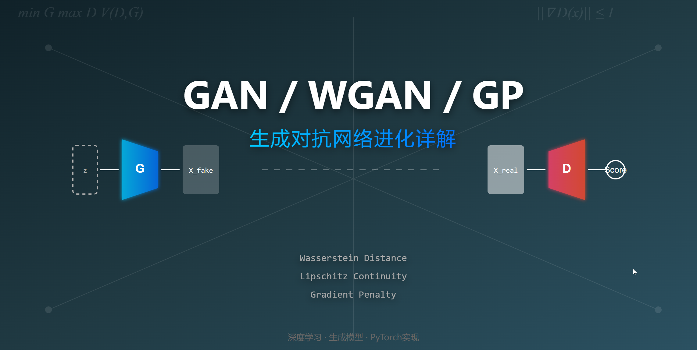 本文将深入浅出地梳理从 GAN 到 WGAN 再到 WGAN-GP 的演进逻辑,分析它们背后的数学直觉,并提供核心代码实现。