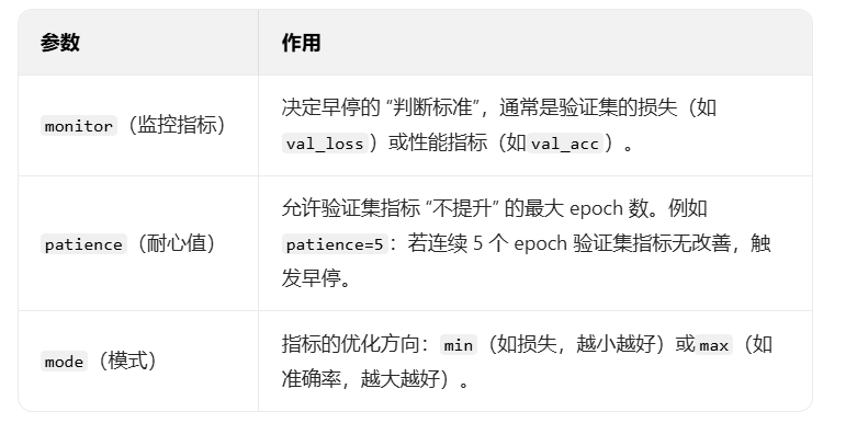 早停的核心逻辑是 "监控验证集指标,当指标不再提升时停止训练",需明确 3 个关键参数(缺一不可):