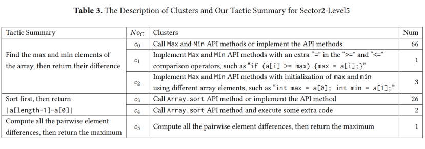 表3 显示了 Sector2-Level5 的详细结果。我们根据 PaCon 的聚类结果总结了三种策略:"找出数组的最大和最小元素,然后返回它们的差值","先排序,然后返回 |a[length-1]-a[0]|",以及"计算所有成对元素的差值,然后返回最大值" 。