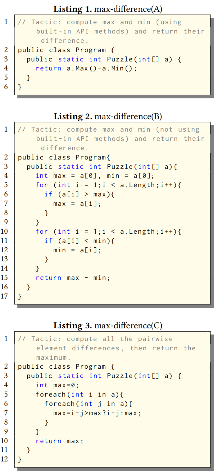 Listings 1-3 展示的示例关于"在一个整数数组中找出任意两个元素的最大差值"的编程作业,其中输入 a 不为空 。在Listings 1-3 中,max-difference(A)、max-difference(B) 和 max-difference(C) 展示了三个提交的快照,它们在功能上都是正确的 。