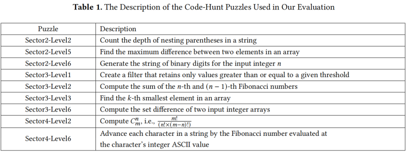 Code-Hunt。Code-Hunt 数据集 包含来自48小时全球编程竞赛的提交 。竞赛有四个部分,每个部分包含六个谜题,参与者(学生)在时间限制内可以无限次尝试解决编程问题 。我们选择这个数据集是因为其谜题的难度代表了入门级编程课程的作业,同时也因为该数据集被用于相关工作 。