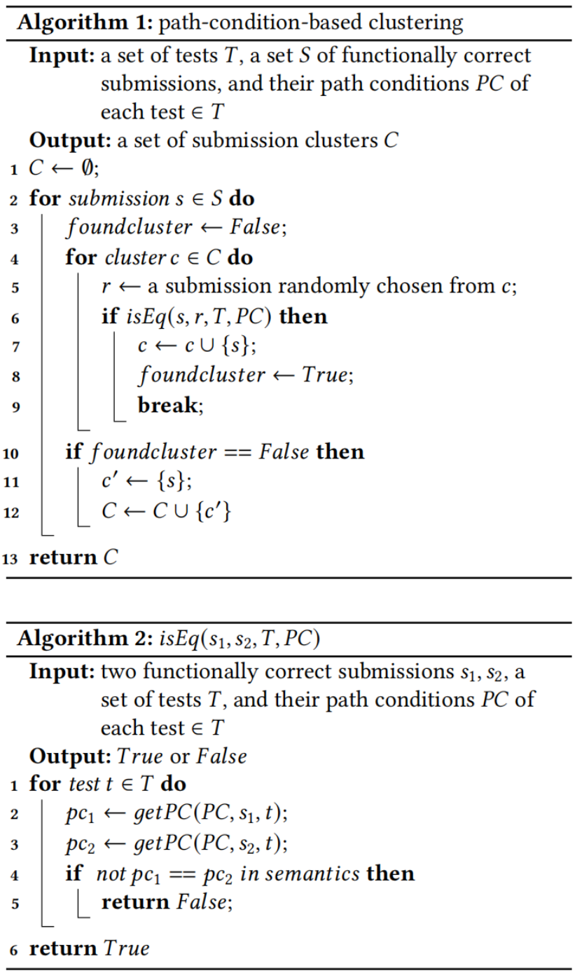 编程课程的注册人数正急剧增加 。为了保持编程课程的教学质量,教师需要能够大规模地理解学生表现并据此提供反馈的方法 。例如,对于教师而言,识别编程提交中使用的不同解题方法(本文定义为策略,tactics )非常重要 。然而,由于策略存在多个抽象层级,且同一策略的实现具有高度多样性,教师手动完成策略识别任务不仅具有挑战性,而且耗时费力 。针对这一任务,我们提出了 PaCon,一种对功能正确的编程提交进行聚类的符号分析方法,旨在提供一种识别策略的途径 。具体而言,PaCon 根据程序的语义特征------**路径条件(path conditions)**对提交进行聚类 。由于专注于程序语义,PaCon 能够避免因提交之间细微的语法差异而产生过多聚类的问题 。我们在真实数据集上的实验结果表明,PaCon 能够生成数量合理的聚类,每个聚类都能有效地将那些语法多样性高但共享等效路径条件语义的提交归为一组,从而为策略识别提供了一种有前景的方法。