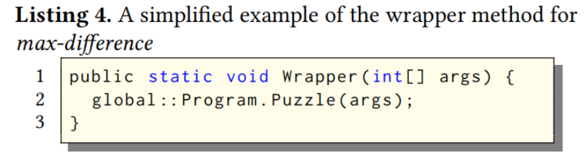 Listing 4 展示了第2节中 max-difference 问题的简化版包装方法。如果存在任何前置条件(即输入参数的约束),教师可以在生成的包装方法中手动添加前置条件 。注意,每个问题只需要一个包装器,因此即使手动准备包装方法,对教师来说也是可接受的工作量 。
